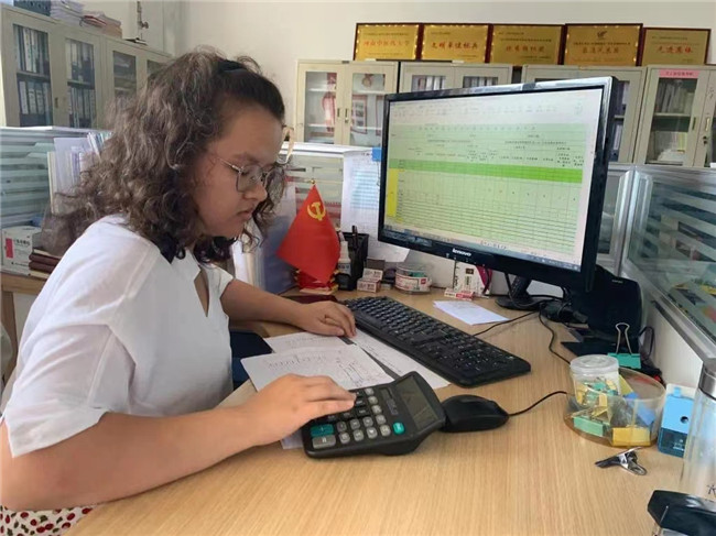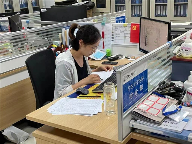 學(xué)生處老師認真統(tǒng)計數(shù)據(jù)