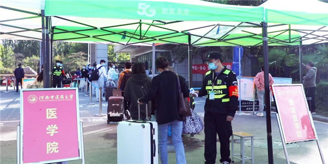 面對防疫、老生返校、迎新報到的三重壓力,河南中醫(yī)藥大學(xué)學(xué)生處帶領(lǐng)學(xué)工人員創(chuàng)新工作思路、改進工作方法、提高工作實效,在確保安全有序的同時考慮得更加細致周到,全程采用信息化系統(tǒng),開展健康監(jiān)測、定位登記和信息審核,提前完成48小時內(nèi)核酸檢測證明等信息收集,實現(xiàn)學(xué)生情況底數(shù)清、情況明、數(shù)據(jù)準(zhǔn)。提前部署返校報到現(xiàn)場,與各職能部門、學(xué)院、書院統(tǒng)籌規(guī)劃,精心準(zhǔn)備,確定具體的現(xiàn)場工作流程,每一個環(huán)節(jié)都嚴謹規(guī)范、細致高效,為學(xué)生順利返校報到提供了第一道屏障。