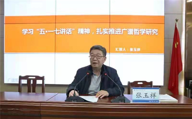 廣譜哲學創(chuàng)建人張玉祥教授作了《學習“5.17講話”精神,扎實推進廣譜哲學研究》的主旨報告。他從“廣譜”兩字的基本含義講起,認為廣譜是馬克思主義關于哲學規(guī)定的題中應有之義。因為馬克思主義的經(jīng)典作家揭示了:哲學是關于自然、社會和思維一般規(guī)律的概括和總結(jié)。這個規(guī)定決定了哲學命題應有最大的普遍性(內(nèi)涵)和最廣的跨域性(外延),這兩點正是“廣譜”的含義。廣譜哲學認為,無論怎么拐彎抹角,這兩點是哲學和所有具體科學的最后區(qū)別。據(jù)此,所有的哲學命題都應該有“廣譜性”,廣譜哲學只是恢復了哲學應有的含義。由于各種原因,傳統(tǒng)哲學概念被賦予了諸多附加的含義。如哲學是“智慧之學”、哲學是“社會科學”、哲學是“意識形態(tài)”、哲學是“反思的學問”等等。廣譜哲學揭示了,這些學說都有各自的偏頗性。因此,“廣譜”兩字具有糾偏的意義。張教授還就廣譜哲學如何堅持和落實馬克思主義哲學的指導地位,如何構(gòu)建具有中國特色的哲學體系,如何實現(xiàn)理論創(chuàng)新等,結(jié)合廣譜哲學的實踐作了深入具體的闡發(fā)。