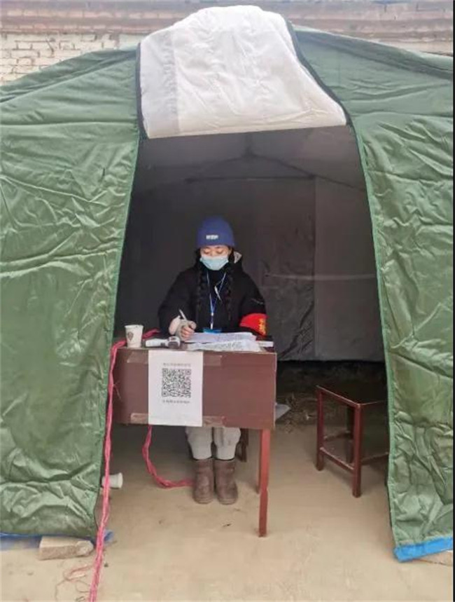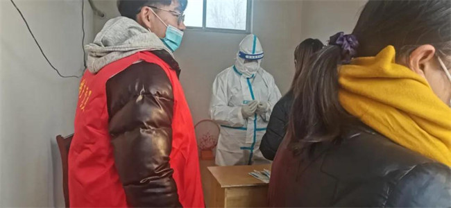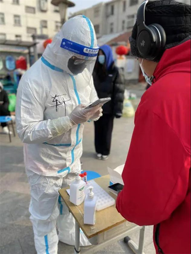 在連續(xù)七次全員核酸檢測試點項目中,為居民建立快速掃碼通道;為了不影響白天正常的全員核酸進程,凌晨四點開始準備防護物品,為從通訊新天地、銀基等高風險地區(qū)返回的密接、次密接居家隔離人員上門做檢測。凌晨的風,冰冷刺骨,常常手指僵硬不聽使喚;凌晨的地面,在白雪的覆蓋下異常光滑,每一步都充滿危險;身穿防護服在狹窄的樓道中來回穿梭,身形尤為笨拙。