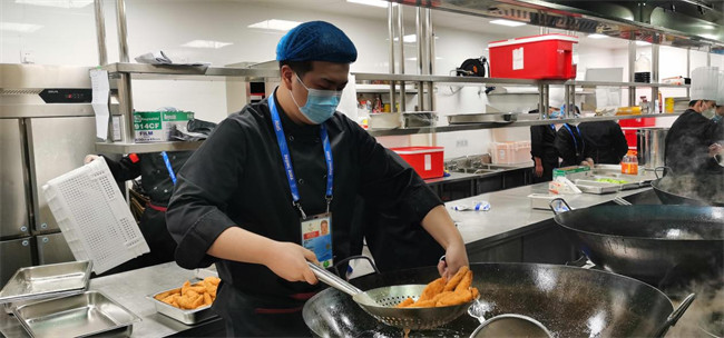 為保證技術(shù)官員和志愿者每天吃到可口的美味,糖醋里脊、紅燒肉、雞里蹦、炸魚排、耗油扒菜膽、五彩素繪......一道道美食每天輪番登場,這些美食的背后離不開烹飪工藝與營養(yǎng)專業(yè)學(xué)生的辛苦付出。他們每天迎著晨曦出發(fā),在后廚進(jìn)行著緊張而有序的工作,披星戴月而歸結(jié)束一天的奮戰(zhàn),為保證每天的花樣美食付出著艱辛的勞動。