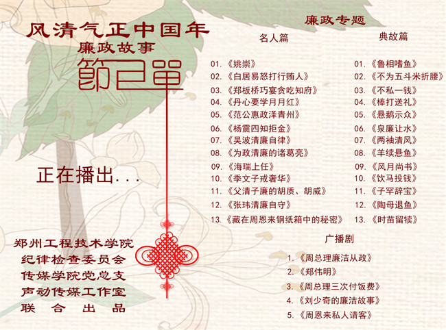《風清氣正中國年——廉政專題》有聲節(jié)目以講述小故事,闡述大道理的方式,引導教育黨員干部做淸正廉潔之人,賦予廉政文化更鮮活、更持久的傳播力和生命力,以達到貫徹落實八項規(guī)定精神,加強能力作風建設的目的。同時,用廉政故事宣傳廉政文化、預防職務犯罪的舉措,是內(nèi)容與形式結合的創(chuàng)新范例。就內(nèi)容來說,廉政系列故事主題突出、立意深遠。就形式而言,有聲故事講述形式群眾喜聞樂見,且充分運用音樂音效,結合圖文表述,達到良好的宣傳效果。同時,節(jié)目的創(chuàng)作與傳播對學生專業(yè)水平的提高、對廉政模范人物的學習也有巨大的促進作用,是一次生動的沉浸式思政課堂。