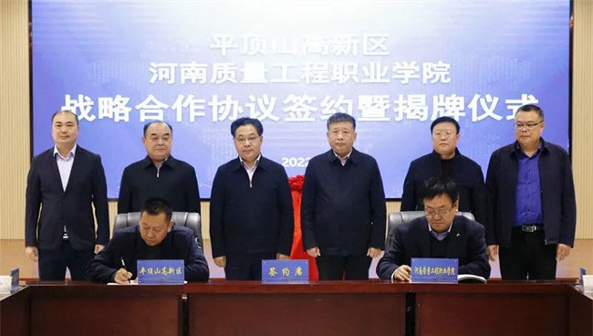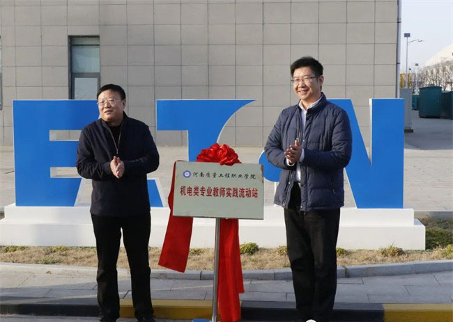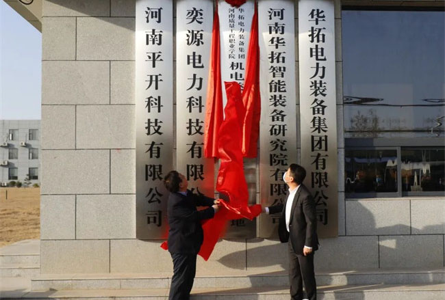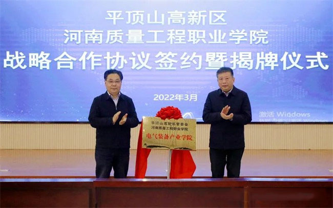 邱紅標(biāo)和凌兵奎共同為“平頂山高新技術(shù)產(chǎn)業(yè)開發(fā)區(qū)管理委員會、河南質(zhì)量工程職業(yè)學(xué)院電氣裝備產(chǎn)業(yè)學(xué)院”揭牌;徐宗華和華拓電力裝備集團有限公司總裁李憲鵬共同為“河南質(zhì)量工程職業(yè)學(xué)院機電專業(yè)產(chǎn)教融合生產(chǎn)性實訓(xùn)基地”揭牌;田新現(xiàn)和伊頓平頂山工廠總經(jīng)理高付民共同為“河南質(zhì)量工程職業(yè)學(xué)院機電專業(yè)教師實踐流動站”揭牌。