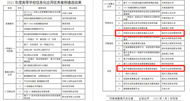 中新河南網(wǎng)3月8日電(李園園) 近日,河南省教育廳辦公室發(fā)布《關(guān)于2021年度高校信息化應(yīng)用優(yōu)秀案例的通知》(教辦科技[2022]52號),遴選出35個高等學(xué)校信息化應(yīng)用優(yōu)秀案例,升達(dá)經(jīng)貿(mào)管理學(xué)院申報的“網(wǎng)絡(luò)安全綜合治理體系建設(shè)與應(yīng)用”“基于智慧校園的校園安全管理體系建設(shè)”兩項案例入選。