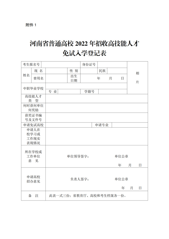 附件 1:河南省普通高等學(xué)校招收技能拔尖人才免試入學(xué)登記表(可登錄學(xué)院官網(wǎng)進(jìn)行下載,鏈接:http://www.xcevc.cn/info/1009/6283.htm)