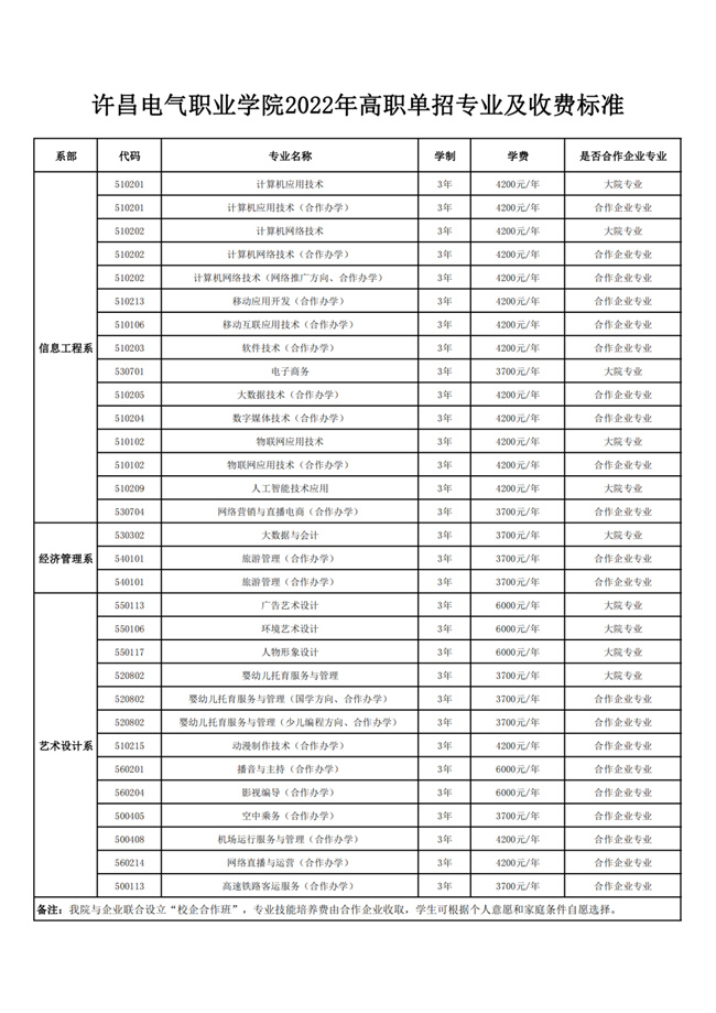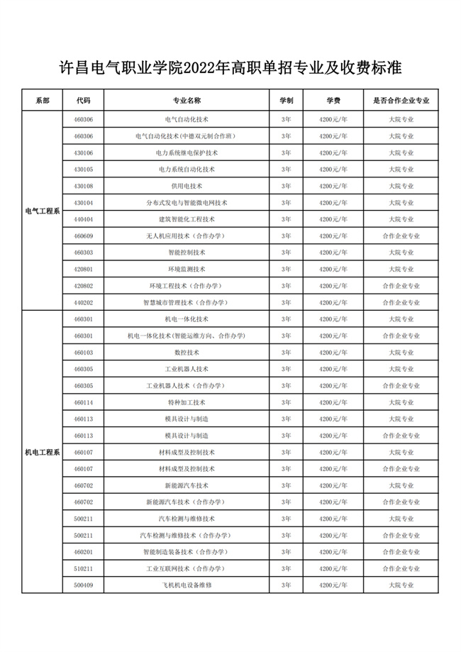 許昌電氣職業(yè)學(xué)院2022年高職單招專業(yè)及收費(fèi)標(biāo)準(zhǔn)