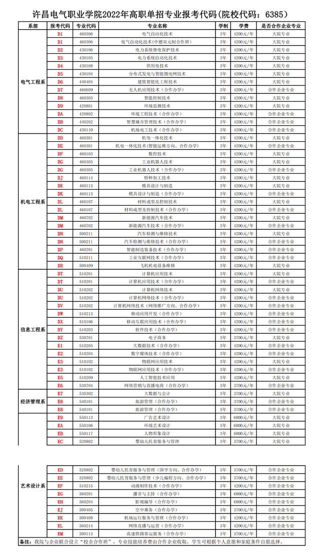 許昌電氣職業(yè)學(xué)院2022年高職單招專業(yè)報(bào)考代碼(院校代碼:6385)