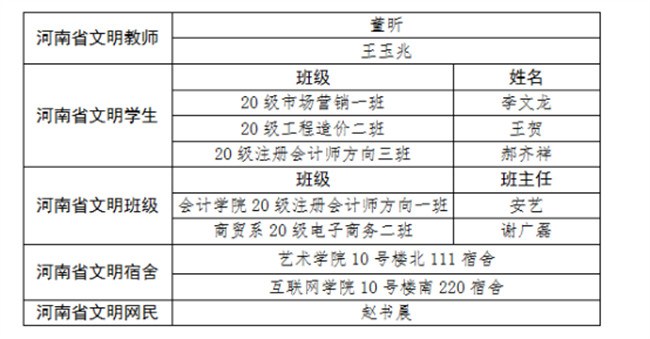 中新河南網(wǎng)4月13日電(李安冉) 日前,河南省委高校工委、河南省教育廳公布了2021年度全省教育系統(tǒng)“兩創(chuàng)兩爭”活動先進集體和先進個人評選結(jié)果,鄭州財稅金融職業(yè)學(xué)院2名教師被授予“河南省文明教師”榮譽稱號;3名學(xué)生被授予“河南省文明學(xué)生”榮譽稱號;2個宿舍被授予“河南省文明宿舍”榮譽稱號;2個班級被授予“河南省文明班級”榮譽稱號;1名教師被授予“河南省文明網(wǎng)民”榮譽稱號。