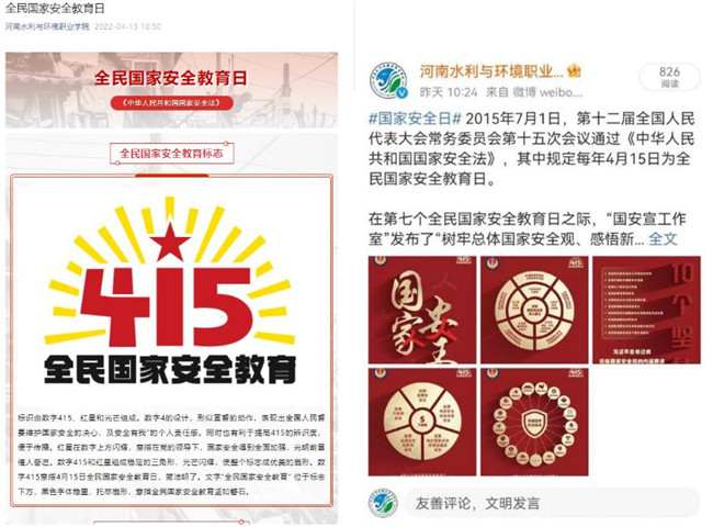 組織一次學(xué)習(xí)。校黨委理論學(xué)習(xí)中心組結(jié)合學(xué)校工作進行深入研討;基層黨支部把“4·15”全民國家安全教育日宣傳教育納入本月主題黨日活動,全體教職工在政治理論學(xué)習(xí)時間,開展網(wǎng)絡(luò)安全專題學(xué)習(xí)教育和以學(xué)校《章程》為核心的校內(nèi)規(guī)章制度教育,有針對性地進行校園安全、師德師風(fēng)等宣傳教育,并簽訂《文明使用微信微博客戶端承諾書》;校團委和各系部召開主題團日活動,組織學(xué)生觀看《無線網(wǎng)絡(luò)安全》《總體安全·固本寧幫》等國家安全教育系列主題視頻。