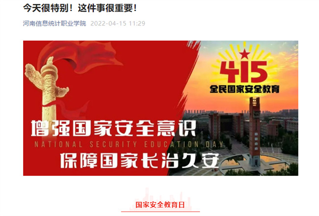 多渠道廣泛宣傳。學院著眼于校園生活中的國家安全隱患,多渠道開展廣泛的“國家安全日”主題宣傳,通過官微平臺和電子大屏幕、宣傳欄等宣傳陣地,張貼和發(fā)布國家安全宣傳資料,擴大宣傳教育覆蓋面,拓展宣傳載體,深入推進國家安全意識入腦入心,引導師生增強國家安全教育理念,提升維護國家安全的自覺性和主動性,起到了良好的國家安全知識宣傳教育作用。