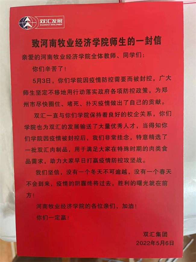 于是,鄭州雙匯食品有限公司,這家入選河南省人民政府農業(yè)產業(yè)化重點龍頭企業(yè)的國人“大廚房”,一邊忙碌地生產、一邊給全校的師生寫了一封暖心的慰問信,鼓勵大家“疫情的陰霾終將過去,勝利的曙光就在前方!”。當晚,公司將一箱箱凝聚著企業(yè)善意與愛心,體現(xiàn)企業(yè)抗擊疫情責任、擔當、奉獻社會熾熱情懷的雙匯火腿腸,送到了學校。