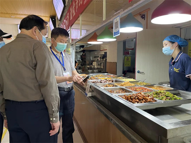 督導組一行對線上教學安排、人員管控、重點場所管理、后勤保障等防疫措施的落實情況進行了實地查看。隨后一行人到學校大門、教學監(jiān)控室、餐廳等與學生學習生活密切相關的場所,詳細了解了教學管理、校園消殺、食品供應、物價監(jiān)管等情況,并對餐廳工作人員的核酸檢測情況進行了抽查檢驗。