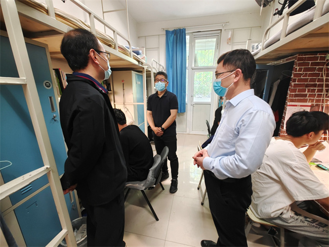 在學(xué)生公寓,學(xué)校領(lǐng)導(dǎo)查看了學(xué)生宿舍門禁系統(tǒng)、線上教學(xué)等情況,看望慰問部分學(xué)生,叮囑他們要嚴(yán)格遵守學(xué)校防疫規(guī)定,爭取共同早日戰(zhàn)勝疫情,并勉勵(lì)同學(xué)們努力學(xué)習(xí)知識,積極進(jìn)取報(bào)效國家。