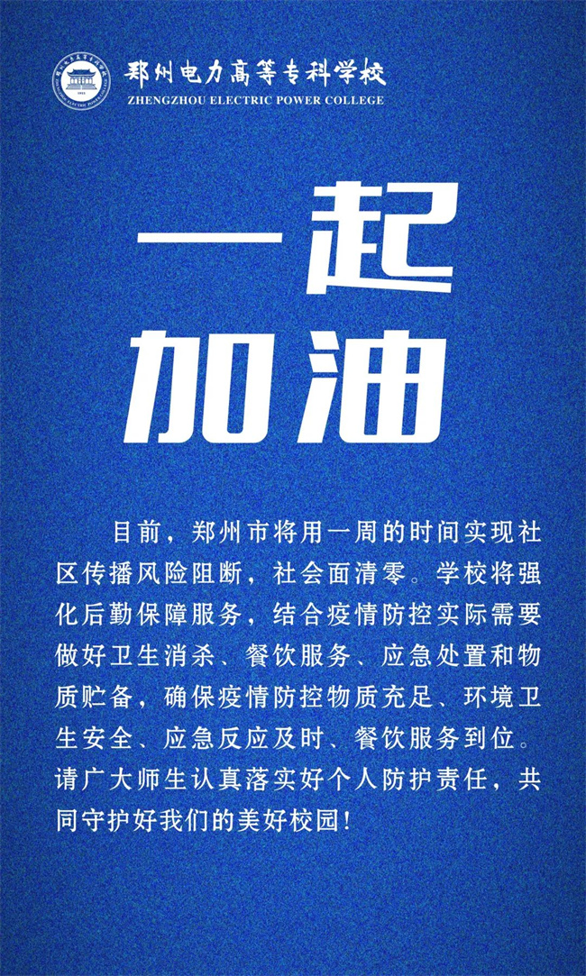 5月3日晚8點(diǎn),鄭州電力高等?茖W(xué)校領(lǐng)導(dǎo)班子召開專題會議,對新近發(fā)生的疫情和后續(xù)態(tài)勢進(jìn)行分析研判,對相關(guān)防控工作作出安排部署。