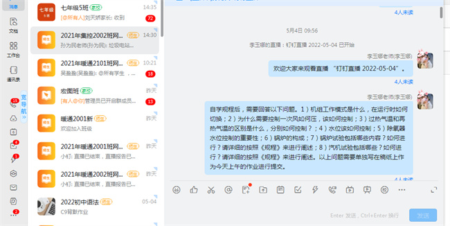 巧用信息化教學(xué)。將授課內(nèi)容結(jié)合實(shí)際情況重新調(diào)整,更新PPT課件;將上課資源分別在云課堂和超星兩個(gè)平臺(tái)都進(jìn)行上傳,便于隨時(shí)切換使用;建立釘釘直播群、微信群,讓同學(xué)們加入……在群內(nèi)通過文件、語音、鏈接、視頻、文字、圖片等不停地進(jìn)行師生互動(dòng)。發(fā)揮互聯(lián)網(wǎng)優(yōu)勢(shì)。主要通過釘釘網(wǎng)絡(luò)教育平臺(tái)向?qū)W生開展同步教學(xué)或輔導(dǎo)。比如實(shí)訓(xùn)課,將上課內(nèi)容及課上用到的文件提前發(fā)送,“以學(xué)生為中心”,邊學(xué)習(xí)邊提問邊總結(jié);在直播時(shí),不定時(shí)、不定人的與某位同學(xué)進(jìn)行連線,讓其回答問題或總結(jié)內(nèi)容;課后不忘給學(xué)生布置一定的作業(yè),并規(guī)定上交時(shí)間。