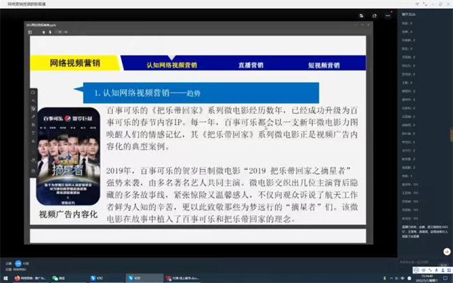 網(wǎng)絡(luò)營(yíng)銷課程中我將思政元素融入到教學(xué)的每個(gè)細(xì)節(jié),在選擇案例時(shí)我在眾多案例選擇能夠激發(fā)同學(xué)們自豪感的案例作為素材。例如在講授視頻營(yíng)銷中采用以中國(guó)航天人員載人飛行作為素材的《摘星者》作為案例,將家國(guó)情懷、親人期許、佳節(jié)團(tuán)圓的期盼等營(yíng)銷元素寓意以產(chǎn)品之中,激發(fā)同學(xué)們的學(xué)習(xí)報(bào)國(guó)的熱情。
