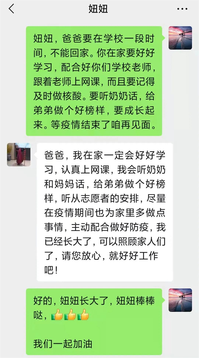 當(dāng)?shù)弥獙W(xué)校關(guān)于疫情工作的安排,考慮到部門女教師較多,她們可能承擔(dān)著比男同志更多的家庭責(zé)任,我經(jīng)過短暫思考,主動(dòng)請(qǐng)纓留校工作與學(xué)校學(xué)生共度疫情難關(guān)。我第一時(shí)間與家人溝通并取得家人的支持,年幼的女兒一段“小大人”模樣的回復(fù),雖然讓我瞬間淚目,也讓我明白:小家在心里,大家在肩頭。