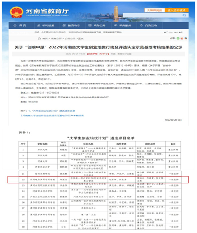 “創(chuàng)響中原”2022年河南省大學(xué)生創(chuàng)業(yè)培優(yōu)行動(dòng)是河南省進(jìn)一步提升大學(xué)生創(chuàng)業(yè)能力,助力大學(xué)生創(chuàng)業(yè)項(xiàng)目可持續(xù)發(fā)展,有效推動(dòng)創(chuàng)業(yè)帶動(dòng)就業(yè)的重要舉措。根據(jù)河南省教育廳安排,經(jīng)鄭州電力高等學(xué)校推薦、資格審查、省級(jí)評(píng)審,省教育廳最終從全省高校(含本、?)申報(bào)的優(yōu)秀創(chuàng)業(yè)項(xiàng)目中,評(píng)審遴選出30個(gè)項(xiàng)目入圍“大學(xué)生創(chuàng)業(yè)項(xiàng)目培優(yōu)計(jì)劃”,并給予資金扶持。