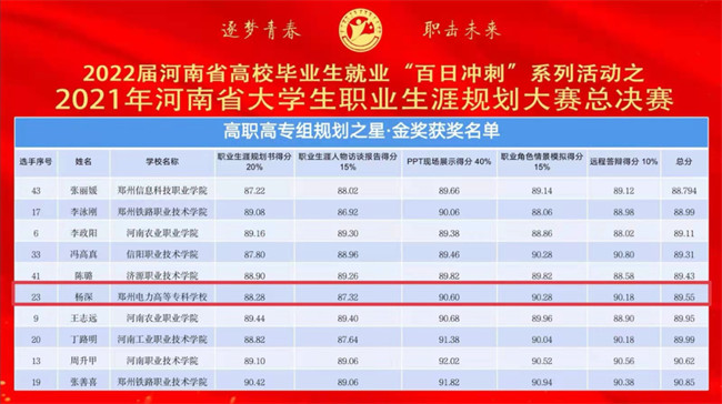中新河南網(wǎng)6月6日電(李安杰) 近日,河南省教育廳公布了《關于2021年河南省大學生職業(yè)生涯規(guī)劃大賽獲獎名單的公示》,鄭州電力高等?茖W校電力工程學院楊深等10名選手(高職高專組)榮獲規(guī)劃之星·金獎,張菲凡等15名選手(高職高專組)榮獲規(guī)劃之星·銀獎;該校指導老師武娜、趙哲、李君、陳鳳玲、何紅杰等被評為河南省大學生職業(yè)生涯規(guī)劃優(yōu)秀指導教師;學校獲得優(yōu)秀組織獎。