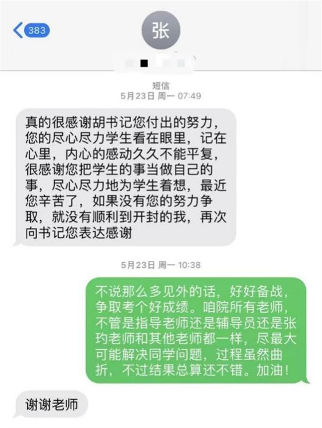 小張同學(xué)給輔導(dǎo)員和副書記都發(fā)了很長的信息,她說:“真心感謝老師們付出的努力,老師們的盡心盡力我們看在眼里、記在心里。很感激學(xué)校和老師把學(xué)生的事當(dāng)做自己的事,全心全意地為學(xué)生著想。如果沒有學(xué)校的協(xié)調(diào)、老師們的努力爭取,就不可能這么順利返回開封到達(dá)學(xué)校。”