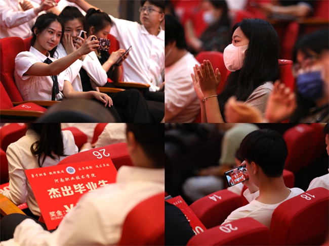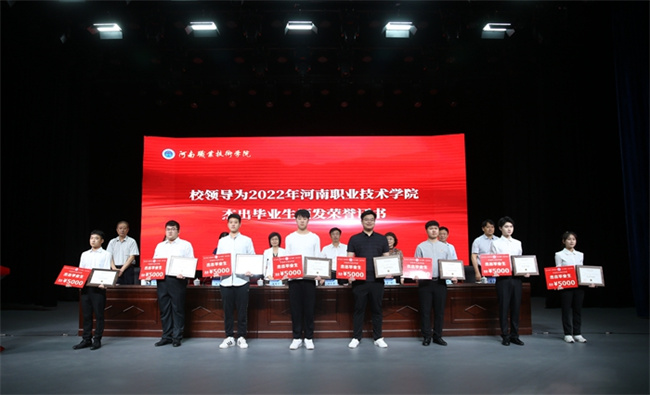 校長(zhǎng)梅樂堂為2022屆畢業(yè)生代表頒發(fā)了畢業(yè)證書;副校長(zhǎng)肖瓏宣讀了2022年學(xué)校杰出畢業(yè)生表彰文件后,校領(lǐng)導(dǎo)分別為杰出畢業(yè)生頒發(fā)榮譽(yù)證書。青年教師蔡晶晶代表全體教師為畢業(yè)生送上祝福,并叮囑畢業(yè)生們既要仰望星空,又要腳踏實(shí)地,做新時(shí)代有為青年;杰出畢業(yè)生蔡紀(jì)闖代表全體畢業(yè)生表達(dá)了對(duì)學(xué)校和師長(zhǎng)的感謝,并號(hào)召同學(xué)們要將“河職精神”熔鑄于生命之中,在未來的各個(gè)領(lǐng)域拼搏奮進(jìn),發(fā)光發(fā)熱。