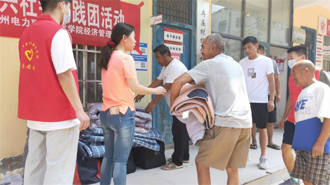 圖為經(jīng)濟(jì)管理學(xué)院團(tuán)總支書(shū)記韓佳星對(duì)貧困家庭發(fā)放愛(ài)心物資