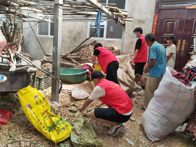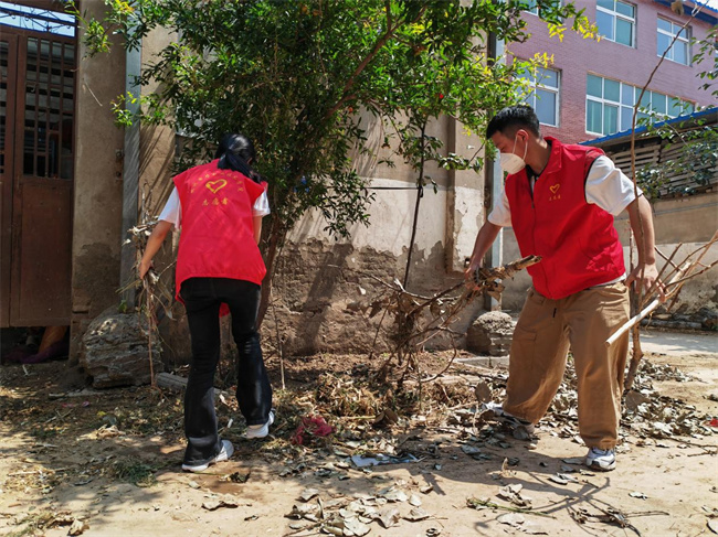 圖為志愿者幫助農(nóng)戶(hù)打掃院子