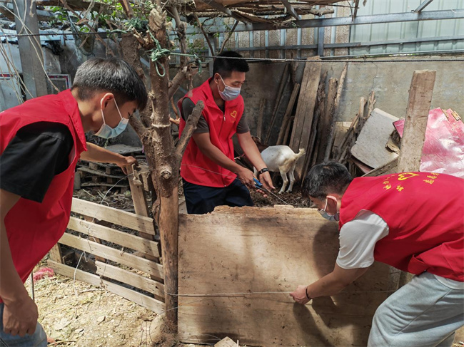 圖為志愿者幫助農(nóng)戶(hù)搭建羊圈