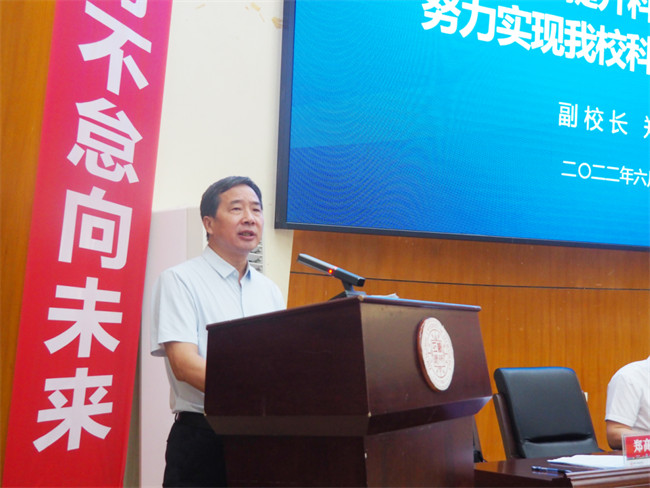 副校長鄭高飛作了題為《進一步提升科技創(chuàng)新能力 努力實現(xiàn)我?蒲泄ぷ餍驴缭健返目萍脊ぷ鲌蟾,報告總結了學校2021年的科技工作取得的成績,對下一階段的工作進行了具體安排。報告指出,全體師生員工要聚集力量,敢為人先,追求卓越,努力探索科學前沿,發(fā)現(xiàn)和解決新的科學問題,攻堅克難,進一步提升科技創(chuàng)新能力,推動特色應用型本科建設,為地方經(jīng)濟社會發(fā)展貢獻“鄭工智慧”。