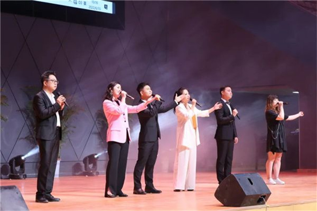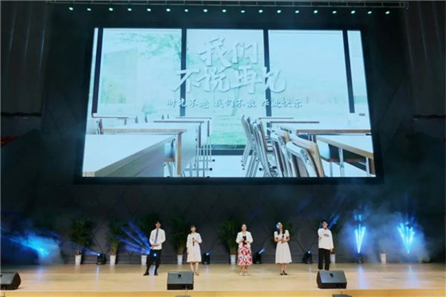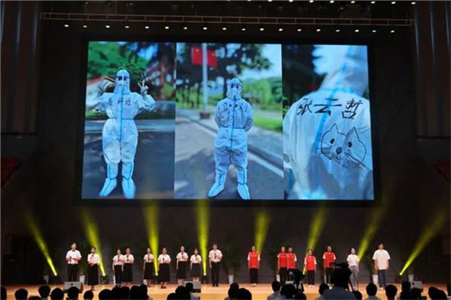 在節(jié)目展演環(huán)節(jié),師生們共同深情演唱《能不能不要說(shuō)再見(jiàn)》《鳳凰花開(kāi)的路口》等歌曲,勾起了畢業(yè)生對(duì)大學(xué)生活的無(wú)限回憶,深切表達(dá)對(duì)母校、師長(zhǎng)、同窗的眷戀和感恩。歌曲《春風(fēng)十萬(wàn)里》《再揚(yáng)帆》感人至深、催人奮進(jìn),激勵(lì)著畢業(yè)生們施展才干,實(shí)現(xiàn)夢(mèng)想。朗誦節(jié)目《志愿者》以學(xué)院疫情防控志愿者為題材,彰顯出新時(shí)代青年義無(wú)反顧的奉獻(xiàn)精神。由畢業(yè)班輔導(dǎo)員創(chuàng)作的朗誦《輔導(dǎo)員寄語(yǔ)》,表達(dá)了老師對(duì)畢業(yè)生的不舍和期望,觸動(dòng)著每一位畢業(yè)生的心,贏得現(xiàn)場(chǎng)陣陣掌聲。
