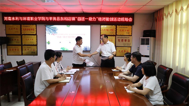 在平輿縣東和店鎮(zhèn),召開了河南水利與環(huán)境職業(yè)學(xué)院與平輿縣東和店鎮(zhèn)“四送一助力”結(jié)對幫創(chuàng)活動現(xiàn)場會,李連水和平輿縣東和店鎮(zhèn)鎮(zhèn)長魏春華代表雙方簽訂了合作協(xié)議,舉行了“書送希望、共沐書香”共建送書活動,并圍繞如何發(fā)揮學(xué)校專業(yè)優(yōu)勢、幫扶當(dāng)?shù)禺a(chǎn)業(yè)發(fā)展、開展文明鄉(xiāng)村共建等事宜進(jìn)行了座談交流,土木工程系副教授李永定結(jié)合鎮(zhèn)產(chǎn)業(yè)發(fā)展現(xiàn)狀、有針對性地介紹了學(xué)校相關(guān)專業(yè)特點和優(yōu)勢。