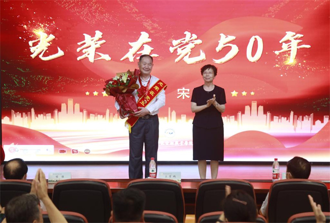 50年風(fēng)雨兼程、50載春華秋實(shí),榮獲黨中央“光榮在黨50年”紀(jì)念章的老同志代表走上領(lǐng)獎(jiǎng)臺(tái)。院黨委書記王霄鸝為老同志獻(xiàn)上鮮花,并佩戴了光榮的紀(jì)念章。