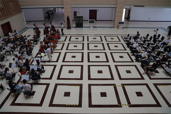 在圖文中心二樓大廳,音樂學院交響樂團現(xiàn)場奏響了《我的祖國》。“一條大河波浪寬,風吹稻花香兩岸……”當樂手們演奏起這段熟悉的旋律,臺下聽眾不禁輕聲哼唱起來,愛國之情在心中久久回蕩。