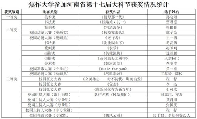 中新河南網(wǎng)7月5日電 近日,中共河南省委宣傳部、河南省教育廳、共青團(tuán)河南省委、河南省文化和旅游廳、河南省科學(xué)技術(shù)廳、河南省學(xué)生聯(lián)合會聯(lián)合下發(fā)了《關(guān)于發(fā)布河南省第十七屆大學(xué)生網(wǎng)上科技文化藝術(shù)節(jié)獲獎作品(個人)和優(yōu)秀組織單位名單的通知》(豫青聯(lián)字〔2022〕9 號),對河南省第十七屆大學(xué)生科技文化藝術(shù)節(jié)各項賽事進(jìn)行了表彰,焦作大學(xué)學(xué)生在比賽中喜獲佳績,其中一等獎1項,二等獎4項,三等獎15項。
