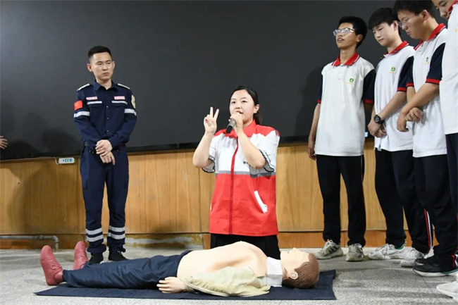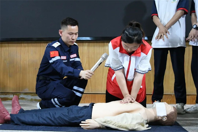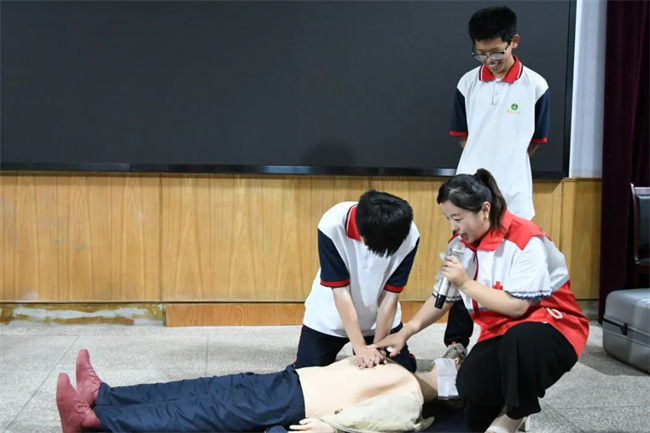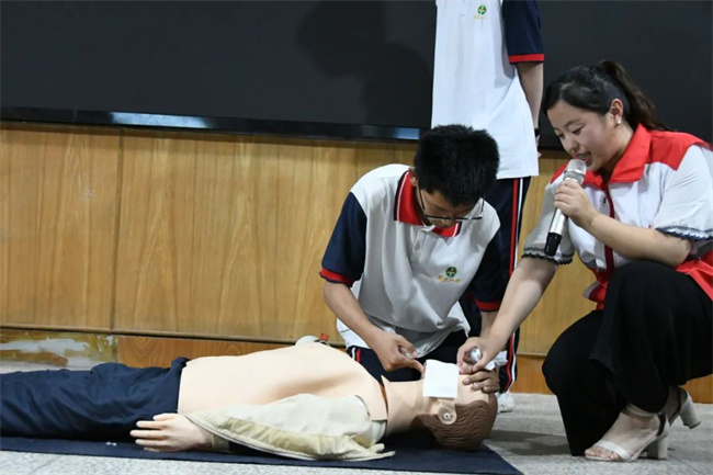 縣紅十字會應(yīng)急救護(hù)培訓(xùn)講師王慧丹,用通俗易懂的語言為師生講解急救知識和技能,重點(diǎn)講解了心肺復(fù)蘇的流程和注意事項(xiàng)。通過實(shí)際操作演練,用人體模型給大家演示心肺復(fù)蘇的整體操作流程,如何打開氣道、做人工呼吸、定位按壓、檢查呼吸等環(huán)節(jié)。學(xué)生們爭先恐后,都想體驗(yàn)下救助過程,縣紅十字會應(yīng)急救護(hù)培訓(xùn)師王慧丹耐心講解,師生們仔細(xì)聆聽,不斷鞏固操作要領(lǐng),通過心肺復(fù)蘇實(shí)操演示,真正掌握了正確的急救方法,做好校園意外傷害和突發(fā)事件的應(yīng)急處理,助力平安校園建設(shè)。并指導(dǎo)學(xué)生們進(jìn)行現(xiàn)場演練,在有限的時間內(nèi)向全校師生有效普及急救技能,收到良好的培訓(xùn)效果。