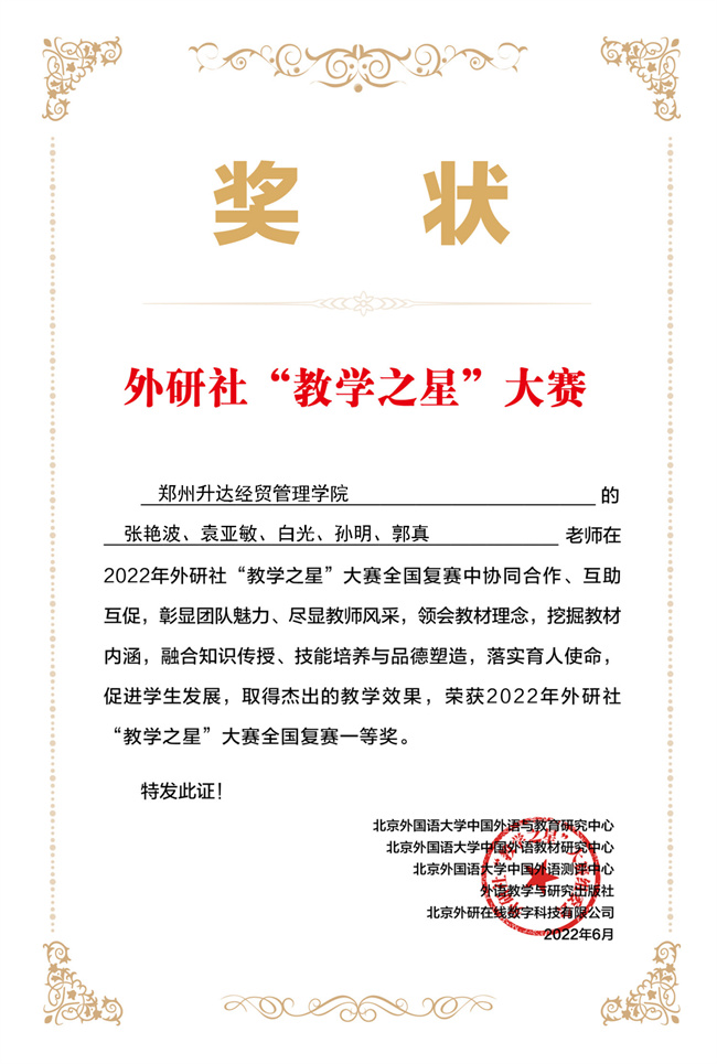 鄭州升達經(jīng)貿(mào)管理學院教師團隊獲得外研社全國“教學之星”大賽復賽一等獎