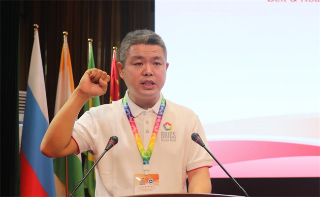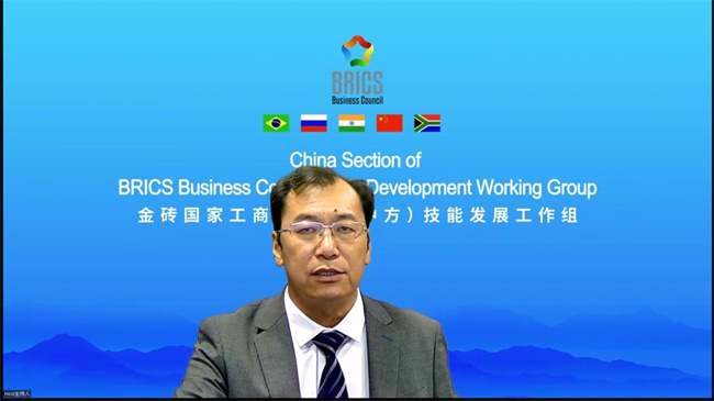 金磚國(guó)家工商理事會(huì)中方技能組主席、一帶一路暨金磚國(guó)家技能發(fā)展國(guó)際聯(lián)盟理事長(zhǎng)、金磚國(guó)家技能發(fā)展與技術(shù)創(chuàng)新大賽組委會(huì)執(zhí)委會(huì)主席劉振英講話
