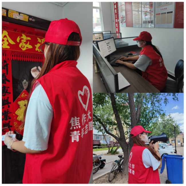 信息工程學(xué)院21級(jí)軟件技術(shù)一班張斯諾返鄉(xiāng)后第一時(shí)間投入到內(nèi)蒙古赤峰市元寶山區(qū)平莊鎮(zhèn)的疫情防控工作中,按照疫情防控常態(tài)化的要求,用實(shí)際行動(dòng)為打贏疫情防控阻擊戰(zhàn)貢獻(xiàn)志愿力量。作為一名青年志愿者,她始終把志愿者精神牢記在心,在志愿活動(dòng)中認(rèn)真負(fù)責(zé),盡力服務(wù),向社會(huì)展現(xiàn)出焦作大學(xué)青年志愿者的風(fēng)采。“此次社會(huì)實(shí)踐活動(dòng)讓我感觸很多,真正理解了‘從群眾中來(lái),到群眾中去’的內(nèi)在涵義,認(rèn)識(shí)到只有把個(gè)人的命運(yùn)同社會(huì)、同國(guó)家的命運(yùn)聯(lián)系起來(lái),才是青年成長(zhǎng)的正確之路。”她說(shuō)道。