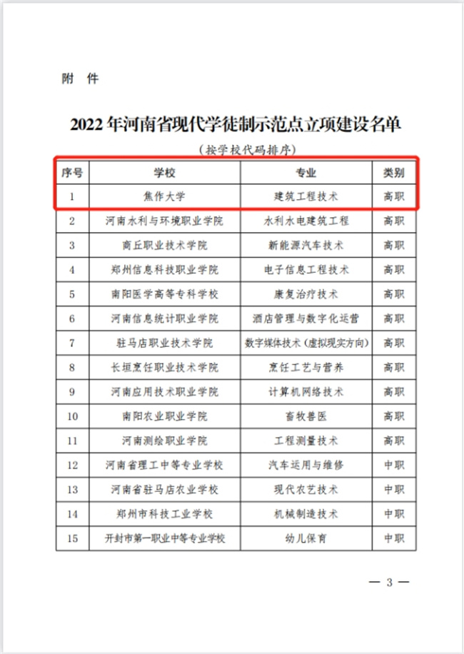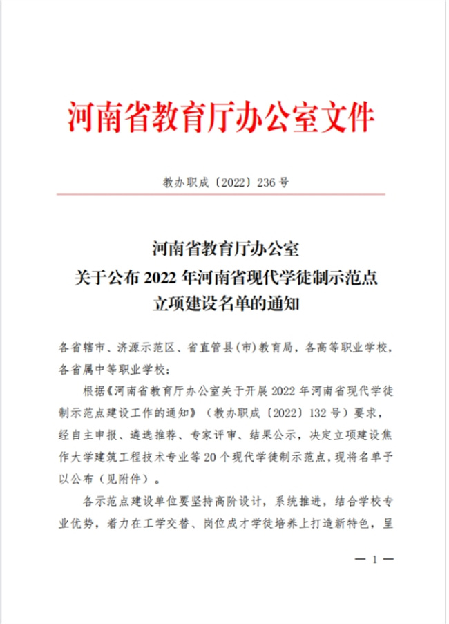 該校土木建筑工程學院與企業(yè)合作積極探索“現(xiàn)代學徒制”人才培養(yǎng)模式改革,實行校企協(xié)同“雙導師”育人模式。土木建筑工程學院已與國隆科技股份有限公司和征云集團有限公司聯(lián)合開展“雙元制”戰(zhàn)略合作,形成了“雙元制”教學基地并組建了“雙元制”訂單班。土木建筑工程學院與征云集團有限公司簽訂了“共建征云智能建造學院”合作協(xié)議書以及“現(xiàn)代學徒制雙元制”合作協(xié)議,并制定了焦作大學征云智能建造學院章程。校企雙方根據(jù)技術技能型人才成長的規(guī)律和崗位的實際需要,共同研討論證、制定人才培養(yǎng)方案,設計實施教學,組織考核評價等,形成了規(guī)范化、制度化、可操作化的具體實施體系。 此次獲批河南省現(xiàn)代學徒制示范點建設單位,是對該,F(xiàn)代學徒制人才培養(yǎng)的充分認可。下一步,學校將結(jié)合“雙高工程”項目建設實際,繼續(xù)堅持高階設計、系統(tǒng)推進,持續(xù)深化產(chǎn)教融合校企雙元育人,不斷擴大現(xiàn)代學徒制合作企業(yè)數(shù)量和學徒規(guī)模,優(yōu)化現(xiàn)代學徒制人才培養(yǎng)方案,促進教育鏈、人才鏈與產(chǎn)業(yè)鏈、創(chuàng)新鏈有效銜接,推動職業(yè)教育體系與勞動就業(yè)體系互動發(fā)展,服務區(qū)域經(jīng)濟,著力打造特色。以點帶面,結(jié)合學校專業(yè)優(yōu)勢,持續(xù)深化產(chǎn)教融合校企雙元育人,穩(wěn)步擴大現(xiàn)代學徒制合作企業(yè)數(shù)量和學徒規(guī)模,全面推進學,F(xiàn)代學徒制工作,努力建設成具有河南特色的現(xiàn)代學徒制示范學校。