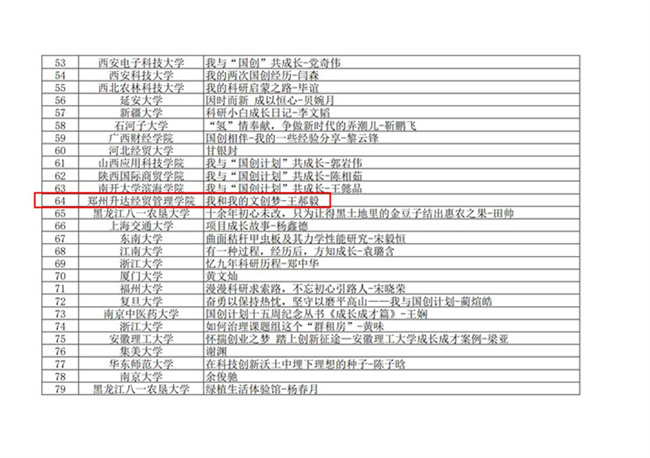 據(jù)悉,在本次征文活動中,專家組共從全國報送的“國創(chuàng)計劃”成長成才篇征文中,遴選出優(yōu)秀文章90篇(見附件),我省共有三所高校進入線上聯(lián)講視頻展示環(huán)節(jié),鄭州升達經(jīng)貿(mào)管理學院是唯一一所入選的民辦高校。
