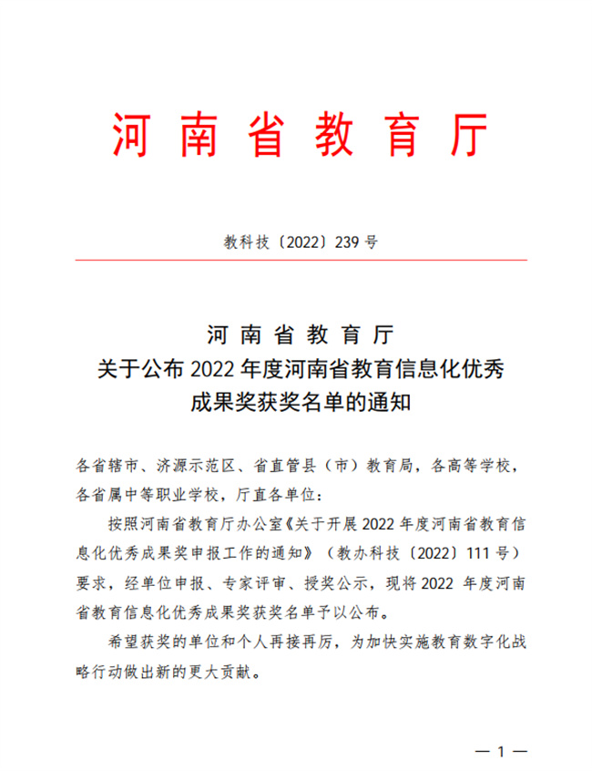 中新河南網(wǎng)8月6日電(徐亞杰) 近日,河南省教育廳下發(fā)了《河南省教育廳關(guān)于公布2022年度河南省教育信息化優(yōu)秀成果獎獲獎名單的通知》(教科技〔2022〕239號)文件,公布了2022年度河南省教育信息化優(yōu)秀成果獎獲獎名單。鄭州升達(dá)經(jīng)貿(mào)管理學(xué)院7項成果獲獎,其中理論研究類成果一等獎2項,二等獎2項;創(chuàng)新應(yīng)用類成果一等獎2項、二等獎1項。