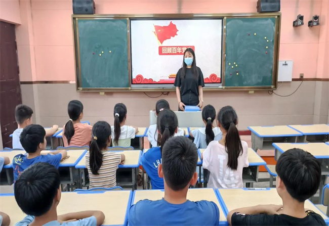實(shí)踐活動(dòng)中,團(tuán)隊(duì)成員走進(jìn)校園、走進(jìn)課堂,通過回顧百年黨史,引出紅色革命故事,激發(fā)學(xué)生學(xué)習(xí)興趣。在課堂上,團(tuán)隊(duì)成員組織學(xué)生觀看紅色影片,開展“角色扮演講黨史”“你畫我猜”等小游戲,將黨史知識(shí)融入游戲,使學(xué)生們?cè)谕嫠V屑由顚?duì)黨史知識(shí)的學(xué)習(xí)。最后,團(tuán)隊(duì)成員號(hào)召學(xué)生一起向黨敬禮,獻(xiàn)禮七一,實(shí)踐活動(dòng)在歡聲笑語中落下帷幕。