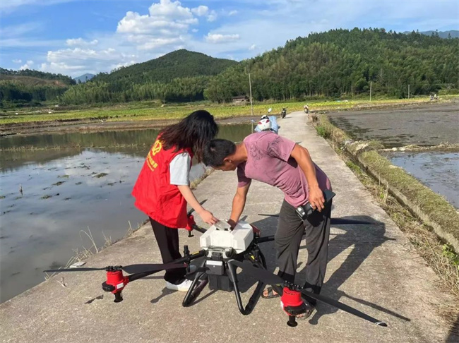 跟隨當(dāng)?shù)胤⻊?wù)站成員了解并參與了無人機(jī)播種水稻項(xiàng)目