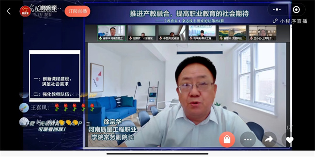 近日,河南質(zhì)量工程職業(yè)學(xué)院常務(wù)副院長徐宗華受光明日報《教育家》雜志編輯部的邀請,參加了《教育家》雜志線上圓桌論壇,論壇主題為“推進(jìn)產(chǎn)教融合,提高職業(yè)教育的社會期待”。本次圓桌論壇共邀請廣西中醫(yī)藥大學(xué)、上海電子信息職業(yè)技術(shù)學(xué)院等全國各地職業(yè)院校的6名專家圍繞“創(chuàng)新課程建設(shè),滿足社會需求”“強化教師隊伍,持續(xù)提高教育質(zhì)量”“完善融合機制,建構(gòu)良性生態(tài)”三項議題進(jìn)行了深入探討。