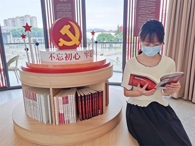 圖為實(shí)踐團(tuán)成員在林村黨史學(xué)習(xí)主題館二樓黨史學(xué)習(xí)室閱覽黨史、村史圖書。