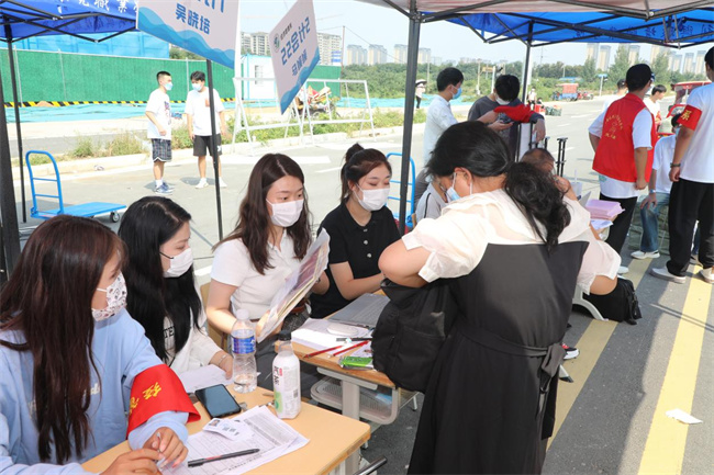 新生經(jīng)過測溫、掃碼、消殺等系列流程進入學(xué)校。校內(nèi)設(shè)置核酸檢測點,第一時間為到校新生提供核酸檢測服務(wù)。