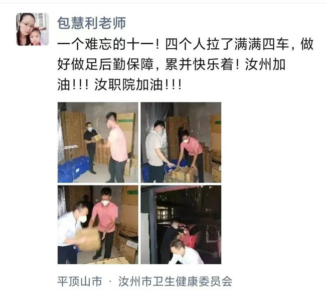 “一個難忘的十一!四個人拉了滿滿四車,做好做足后勤保障,累并快樂著!汝州加油!汝職加油!”。這是凌晨1點(diǎn)34分,包慧利老師在朋友圈寫下的文字。深夜仍在疫情防控指揮部運(yùn)送物資,這是我們強(qiáng)大的后勤保障團(tuán)隊(duì),他們的不計(jì)小我,不辭辛苦,為學(xué)院各項(xiàng)工作提供了物資保障。
