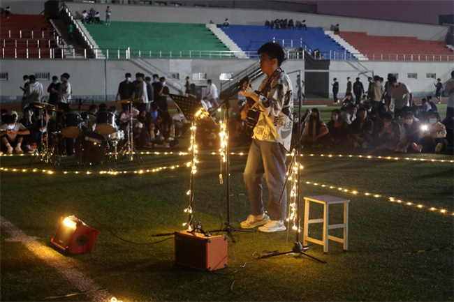 夜幕降臨,機(jī)電學(xué)子來到西田徑場,共赴一場草坪音樂節(jié)之約。燈光點(diǎn)點(diǎn),席地而坐,聆聽美妙的音樂,感受歡快的音律,享受美滿的國慶假期。