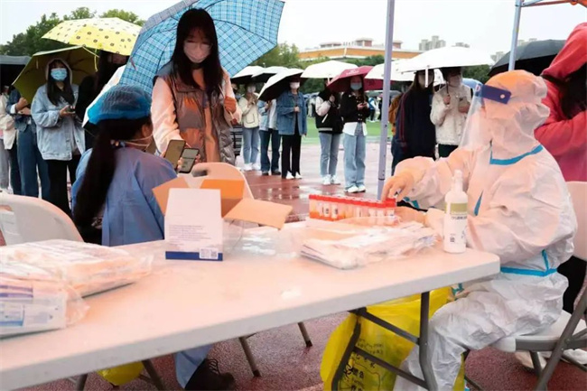 學校在48小時周期內,組織全校免費核酸檢測。核酸檢測現場輔導員分工明確,高效協作,負責班級的調度。現場志愿者秩序維護有序、路線指引認真細致,盡管一直下雨,同學們秩序井然,整個核酸全程安全高效。