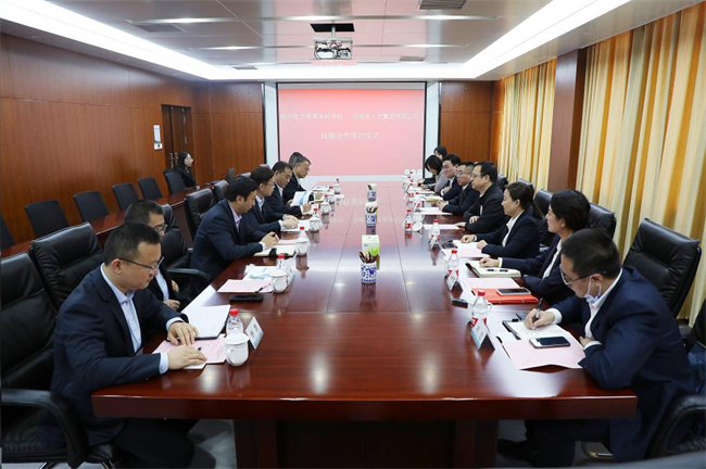 校長(zhǎng)楊建華對(duì)河南省人才集團(tuán)有限公司一行的到來(lái)表示歡迎,并就學(xué)校的基本情況和近幾年的發(fā)展成就進(jìn)行了介紹。他指出,學(xué)校謀求高質(zhì)量發(fā)展,關(guān)鍵在人才,借助河南省人才集團(tuán)的平臺(tái)優(yōu)勢(shì),雙方可在高端人才柔性引進(jìn)、靈活用工、高水平人才庫(kù)建設(shè)、學(xué)生就業(yè)創(chuàng)業(yè)、平臺(tái)共享共建等方面開(kāi)展合作,共謀發(fā)展,實(shí)現(xiàn)共贏。他表示,通過(guò)雙方合作,既能解決在新發(fā)展理念下,學(xué)校人才工作優(yōu)化創(chuàng)新的實(shí)際需求,也可為河南省人才集團(tuán)實(shí)現(xiàn)“立足中原、面向全國(guó),建設(shè)具有河南辨識(shí)度的重要人才中心”這一愿景提供載體。他相信,雙方合作互惠雙贏,隨著合作深化,工作不斷推進(jìn),合作成效逐漸顯現(xiàn),將在河南省教育行業(yè)人才管理創(chuàng)新和職業(yè)教育產(chǎn)教特色融合中成為亮點(diǎn),同時(shí)也將為河南省建設(shè)國(guó)家創(chuàng)新高地做出雙方貢獻(xiàn)。